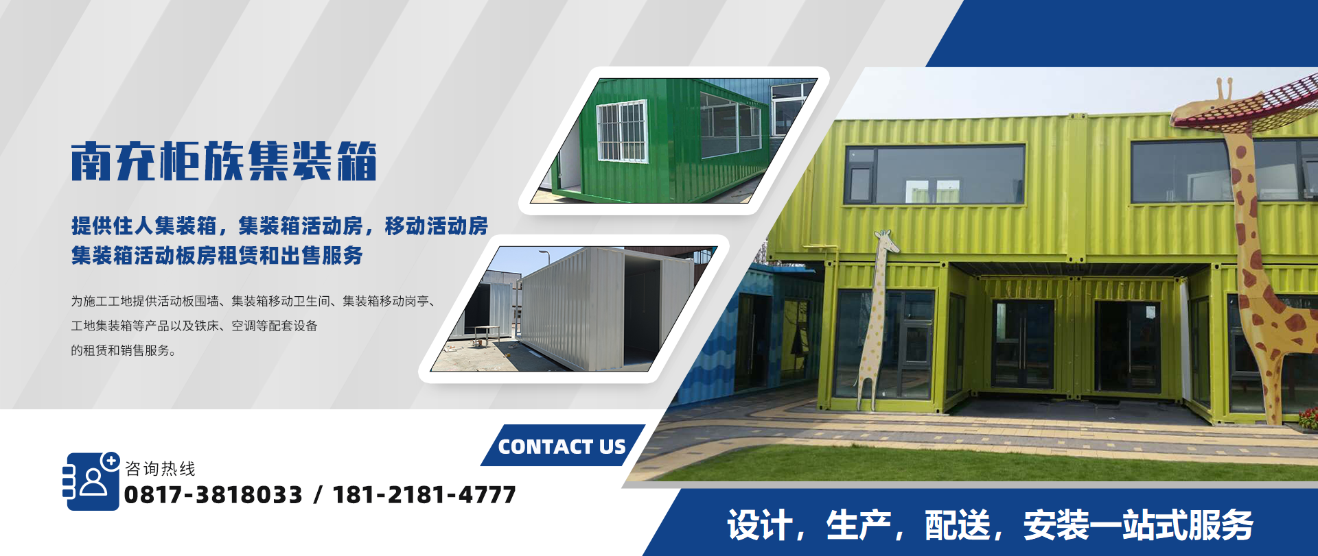南充柜族集裝箱有限公司是一家為南充/遂寧/閬中/營山/蓬安/南部/西充等周邊城市提供住人集裝箱,集裝箱活動房,移動活動房,集裝箱活動板房服務(wù)!本公司專業(yè)服務(wù)南充住人集裝箱、南充移動活動房、南...